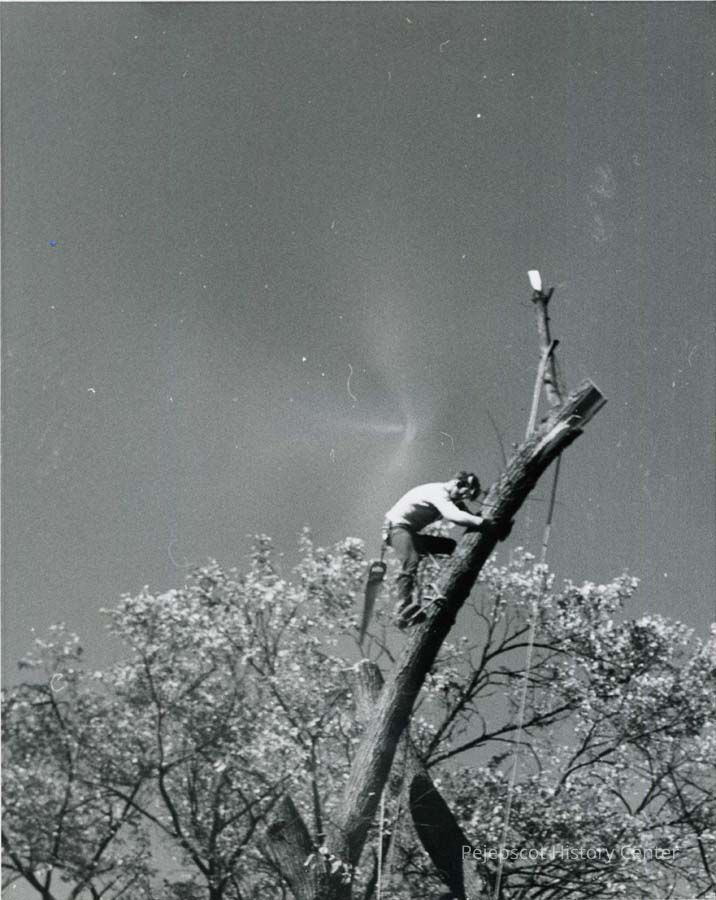 B/W photo of William Lawrence cutting the top off a tree, to make way for Route 1 to Cook's Corner. No date.