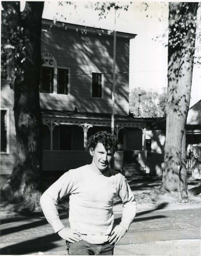 A B/W photograph of William Lawrence, "top man" in Victor Vigue's independent tree removal crew, who worked on clearing land for Route 1 to Cook's Corner. No date.