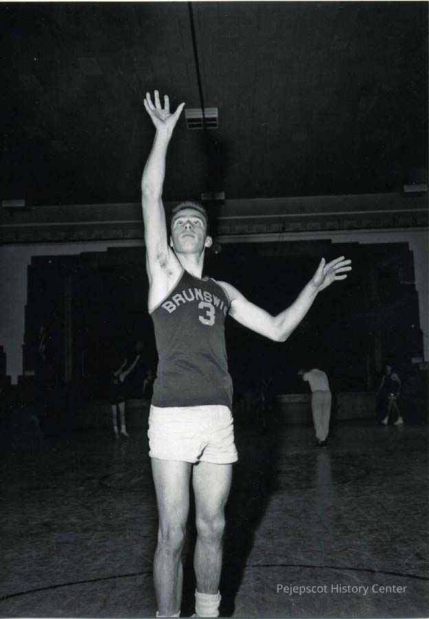 Black & white photograph (from negative) of William Perreault, Brunswick High School basketball player, 1954. He has just tossed ball into the basket.