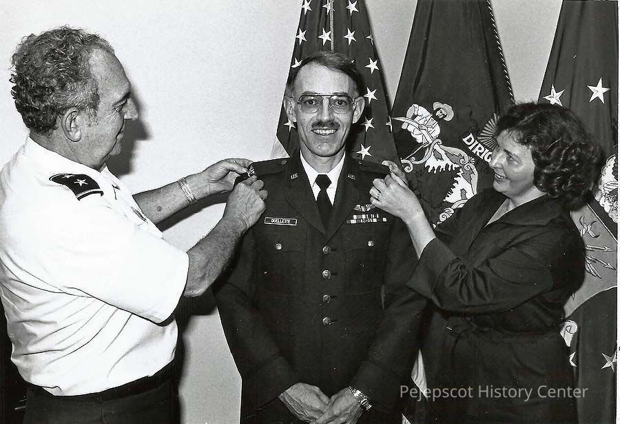 A B/W photo of William R Ouellette of East Harpswell was promoted to the rank of colonel in the Maine Air National Guard. Major Gen. Paul R. Day and Mrs. Ouellette pinned a pair of eagles on his shoulders. Colonel Ouellette practices optometry in Brunswick with Dr. William H. Fox.