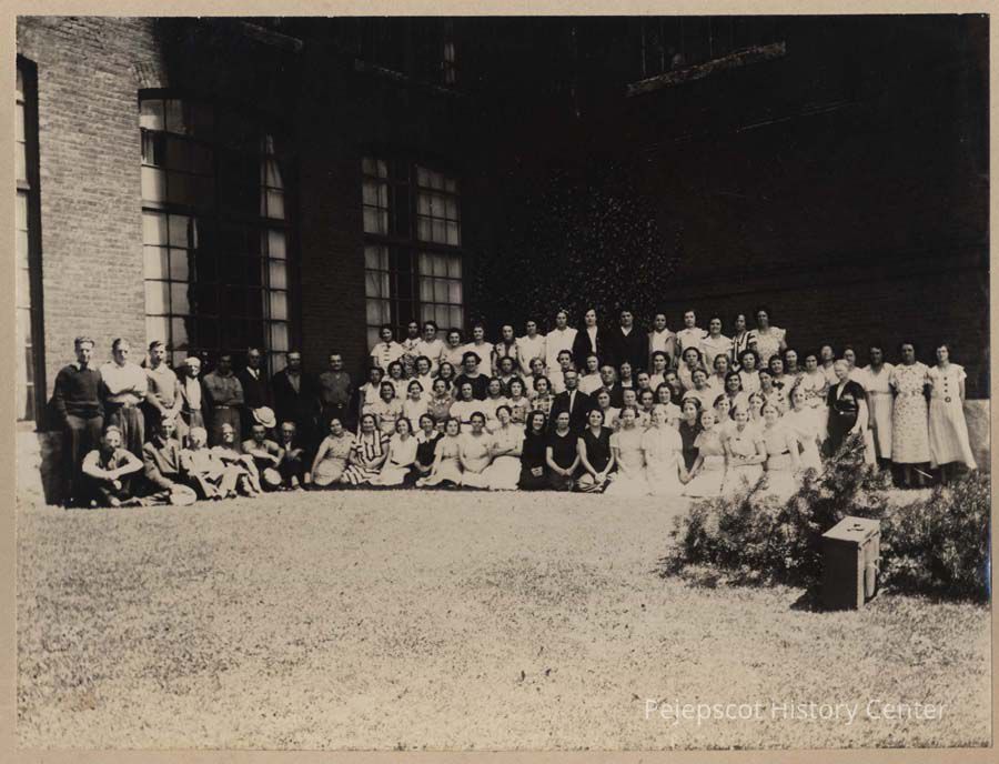 B/W photo of the 1935 day shift of the Winding Room employees at the Cabot Mill.