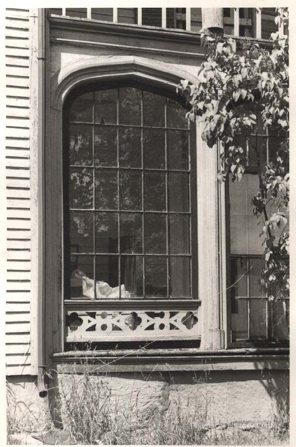 A B/W photograph of a window on the first floor porch of the Chamberlain Home. Undated