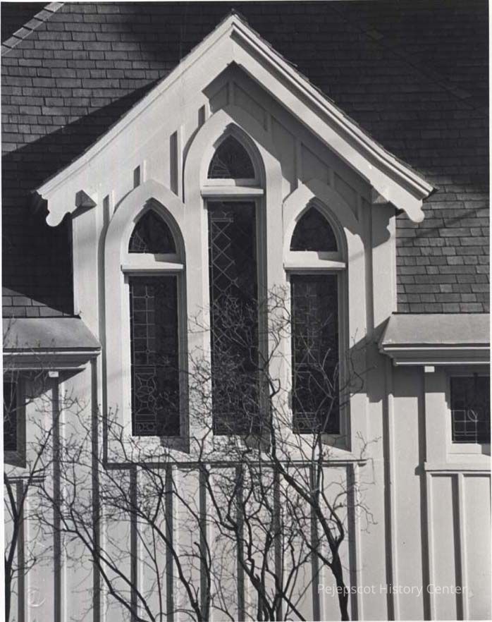 A B/W photograph of the windows at First Parish Church. Undated