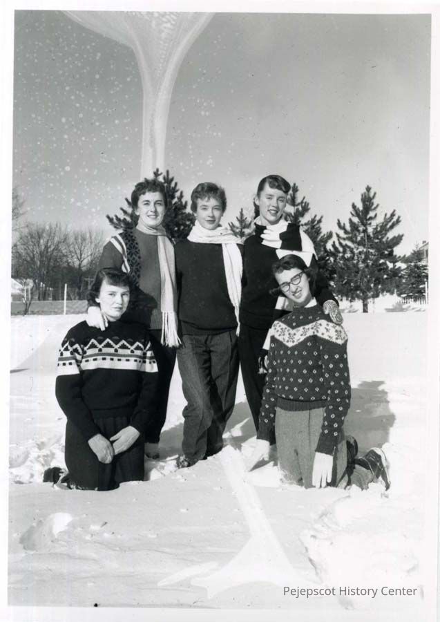 Black and white photograph of Winter Queen contestants. Front: Joanne Lucas, Suzanne Tougas. Standing: Evelyn Doyon, Mary Hanks, Ellen Daggett.