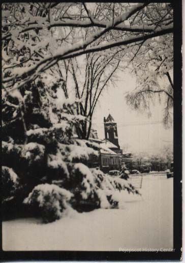 Photo of winter scene of Maine Street looking north from the Mall, Brunswick, Maine. The old Brunswick Town Hall is at center.
