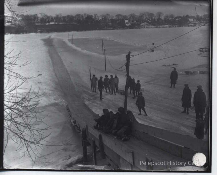 Photo of a winter slide and skating rink in the Androscoggin River near Water Street, Brunswick, Maine.