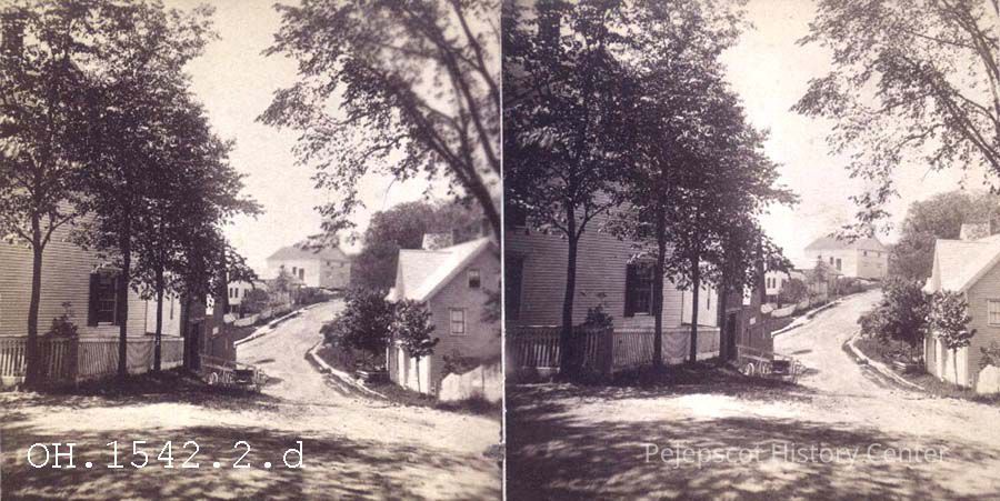 A B/W stereo view of Winter Street, Topsham, ME at the foot of Barrow's Hill. The Freewill Church is in the background. Undated