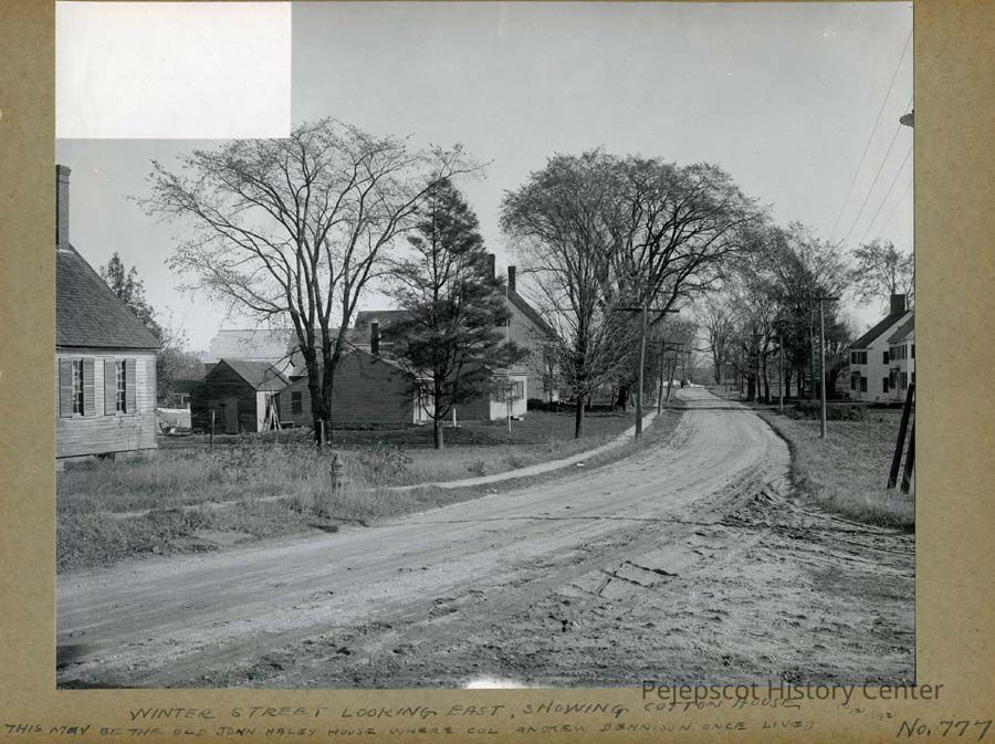 A black and white photo of Winter Street in Topsham looking east. On the left you can see the Cotton House. A note at the bottom of the photo reads, "This may be the old John Haley house where Col Andrew Dennison once lived." A rectangle is missing from the upper left hand corner. 10/21/1921
