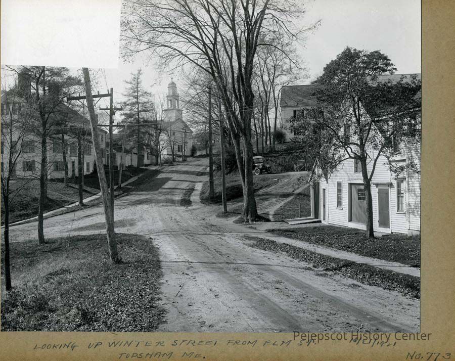 A black and white photograph looking up Winter Street in Topsham from Elm Street. A rectangle has been cut out of the upper left hand corner. 10/21/1921