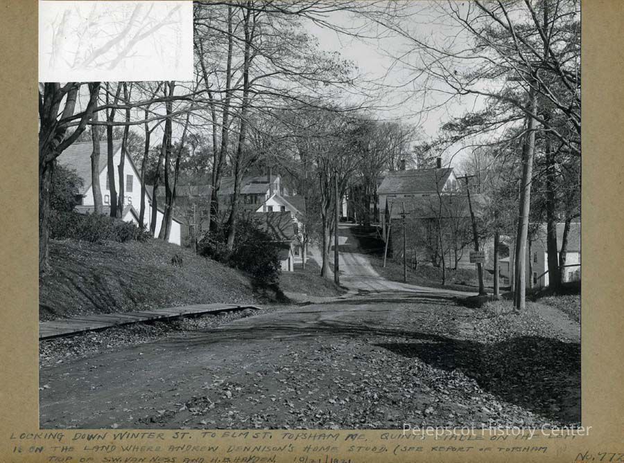 A black and white photo looking down Winter Street in Topsham to Elm Street. Quint's stable on the left is on the land where Andrew Dennison's home stood. A rectangle is whited out in the upper left hand corner. Undated