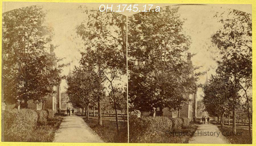A stereo view photo showing Winthrop Hall at Bowdoin College, Brunswick, ME. Published by B. G. Dennison. Not dated.