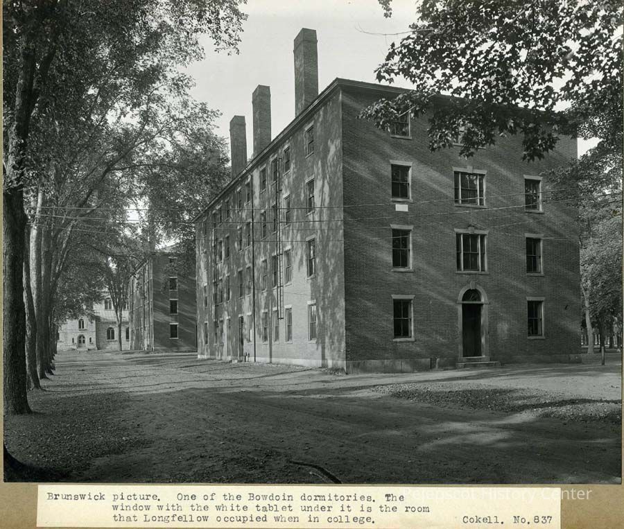 A black and white photograph of Bowdoin College dormitories. The photo was taken with your back to Adams Hall. In the foreground is Winthrop Hall. A white plaque under the 3rd floor window on the left side indicates the room that Longfellow stayed in. Behind Winthrop Hall is Maine Hall. Beyond both dormitories is the Chapel/Banister Hall. Undated