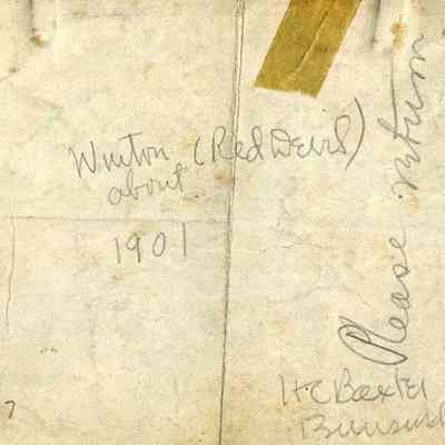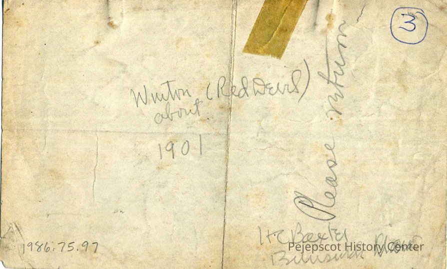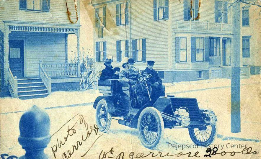 Blue & white 1901 photo of Winton Automobile ("Red Devil"). Two men in front seat, two women and a child in back. Writing on back of photo mentions H. C. Baxter, Brunswick, ME. Photo possibly taken on upper Maine Street