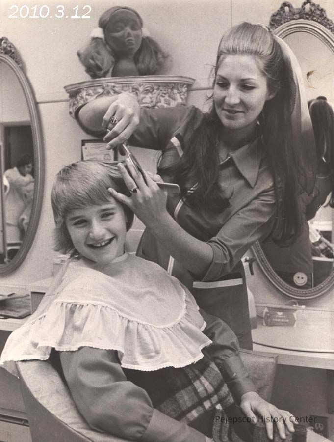 A B/W photograph of a woman cutting a girl's hair. It is marked on the back, "Benefit demonstration." Undated
