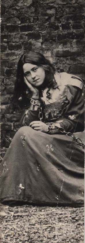 A B/W photograph of a woman in chains. Actress? This photo has been cut out of a larger photo. Undated