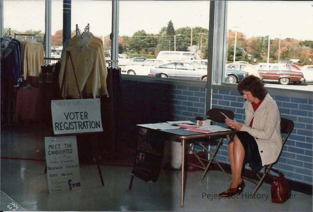 A color photograph of an unknown woman registering voters in Ames Department Store. 10/1983