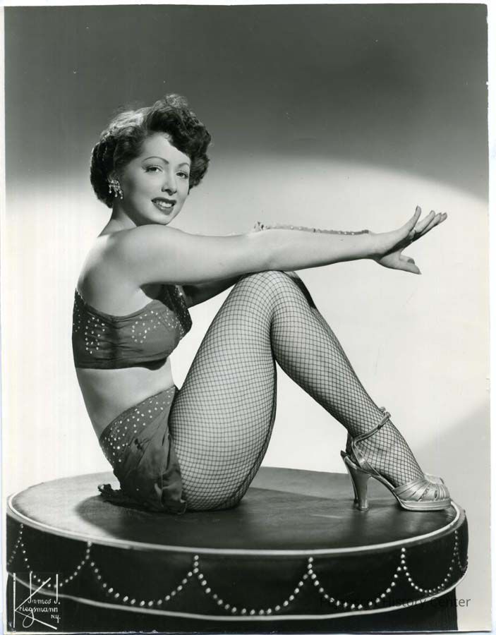 An undated black and white photograph of a woman sitting on a pedestal. The photograph taken by James J. Kriegsmann of New York. The photograph is one 19 photos of entertainers at the State Hotel, 192 Maine Street, Brunswick.