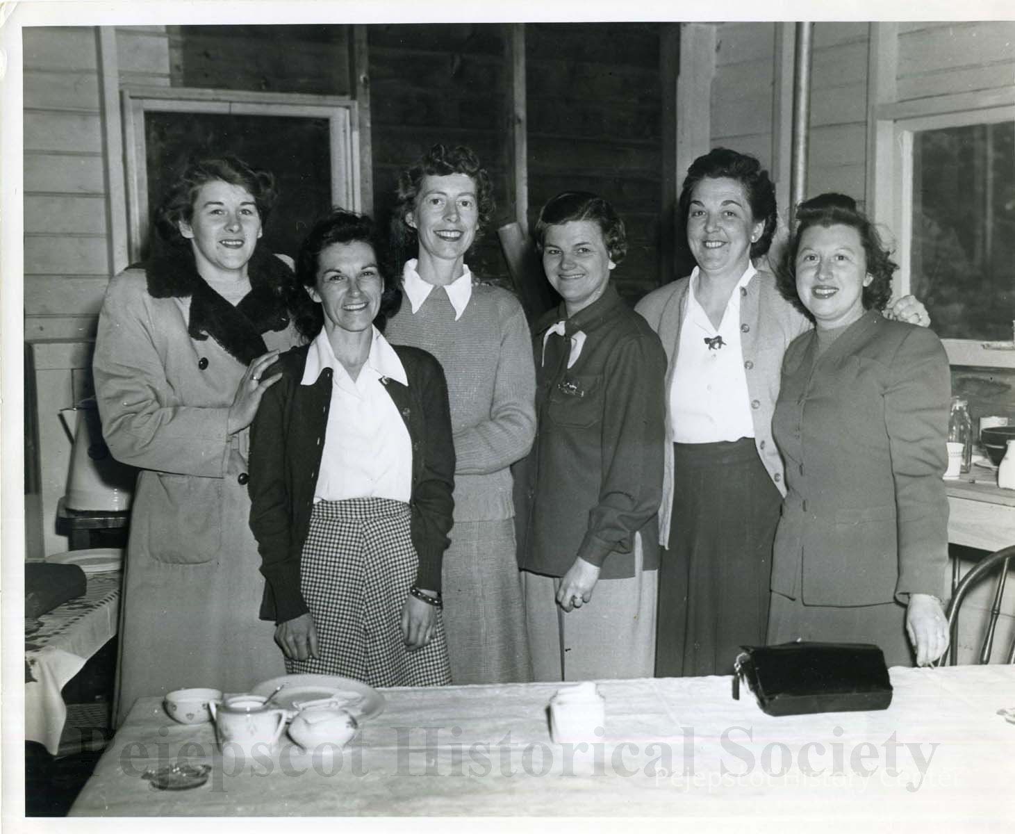 A picture of six women golfers. 1.)?, 2.)?, 3.) Mary Boucher, 4.) Beatrice Booth (Baxter), 5.) Kay Rogers, 6.)? Undated