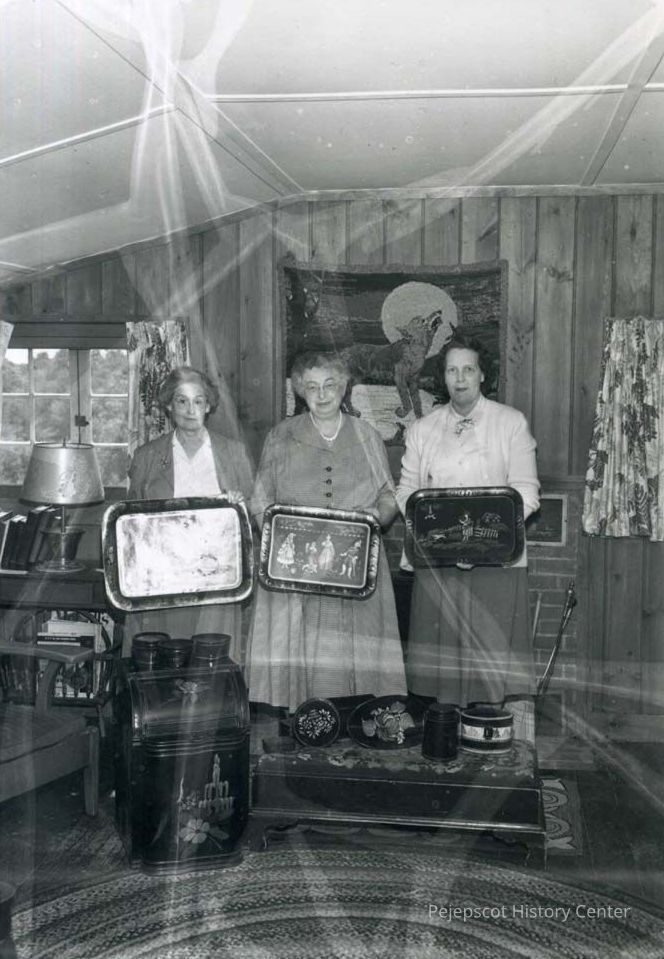 Toleware is often referred to as a folk handicraft, with many housewives in the 19th and first half of the 20th century gathering to paint trays and other household objects together. Tole painting refers to applying paint to tin and other metalware. In this photo, Winnifred Mann, Hazel Burnett, and Linda T. Mason are pictured with toleware trays they painted. Decorative trays have been popular in many eras, from Italian wood trays to modern American plastic trays.