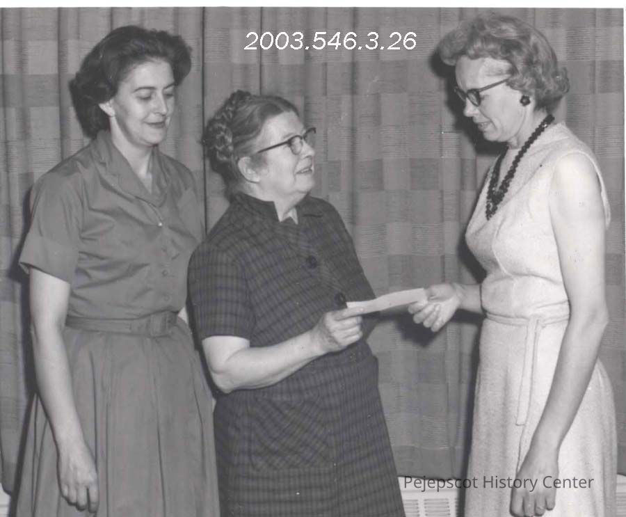 An undated black and white photo of two unknown women presenting a check to an unknown representative of Elmhurst Center in Bath.