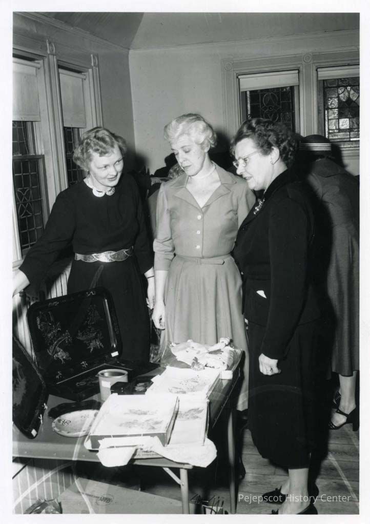 Three members of the Women's Alliance of the Congregation Church look at trays.