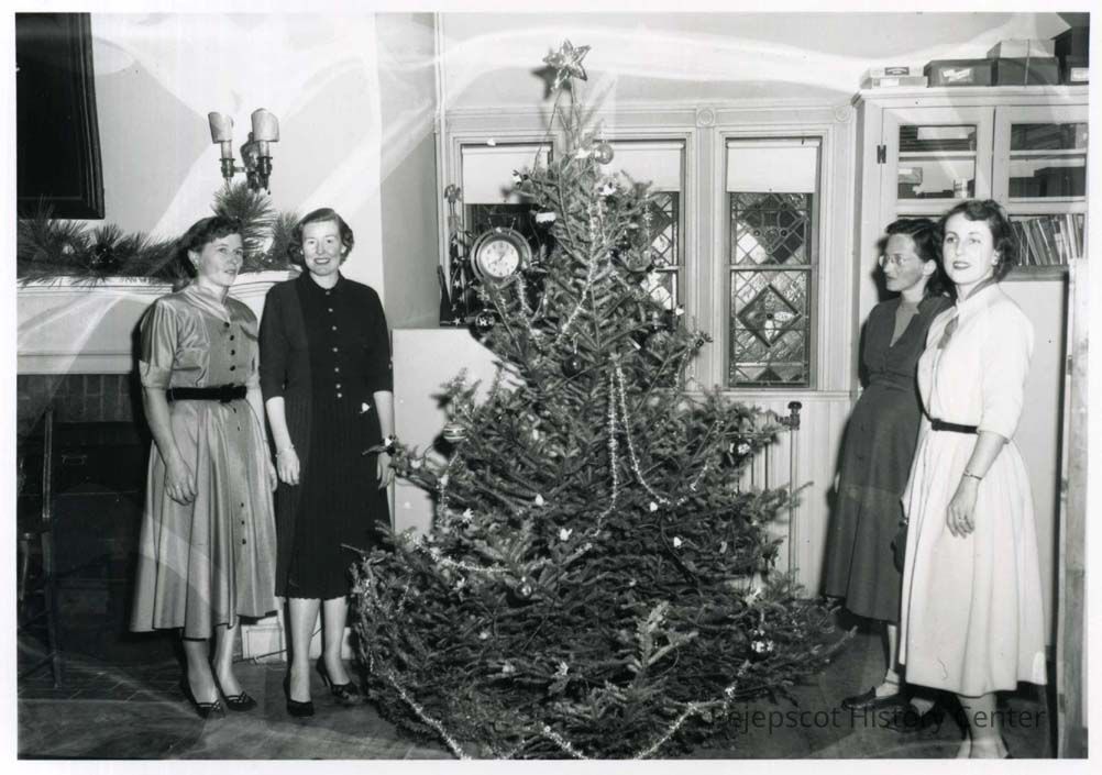 Four members of the Women's Alliance of the First Parish Church stand around a Christmas tree.