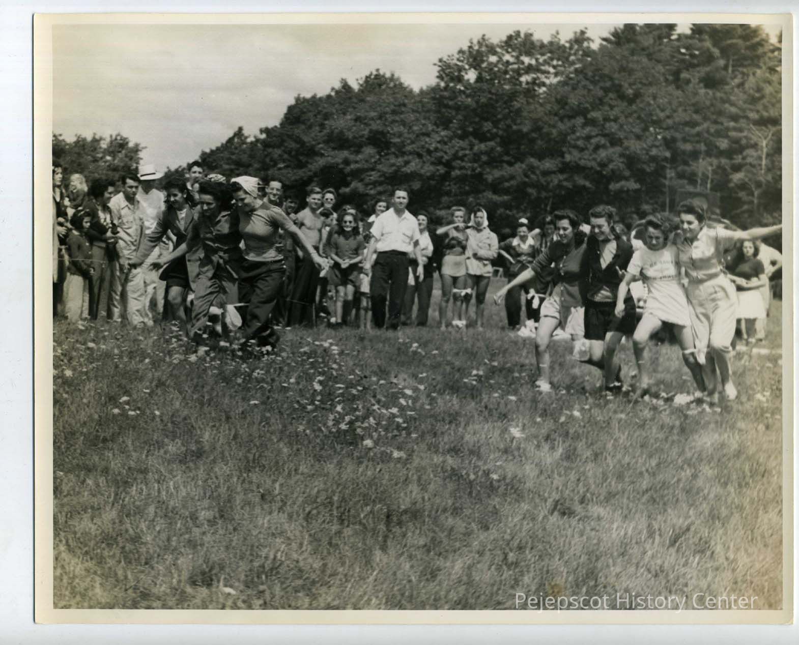 A crowd watches the women's three-legged race held in a field at the Verney Mill picnic. Undated