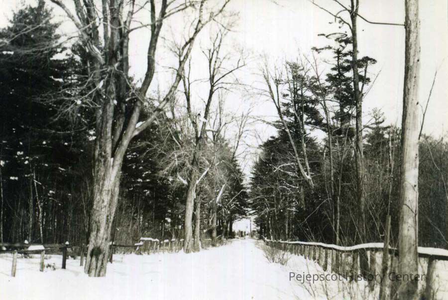 An undated black and white photograph of Woodlawn, Brunswick, Maine, located off Water Street, taken in the winter.