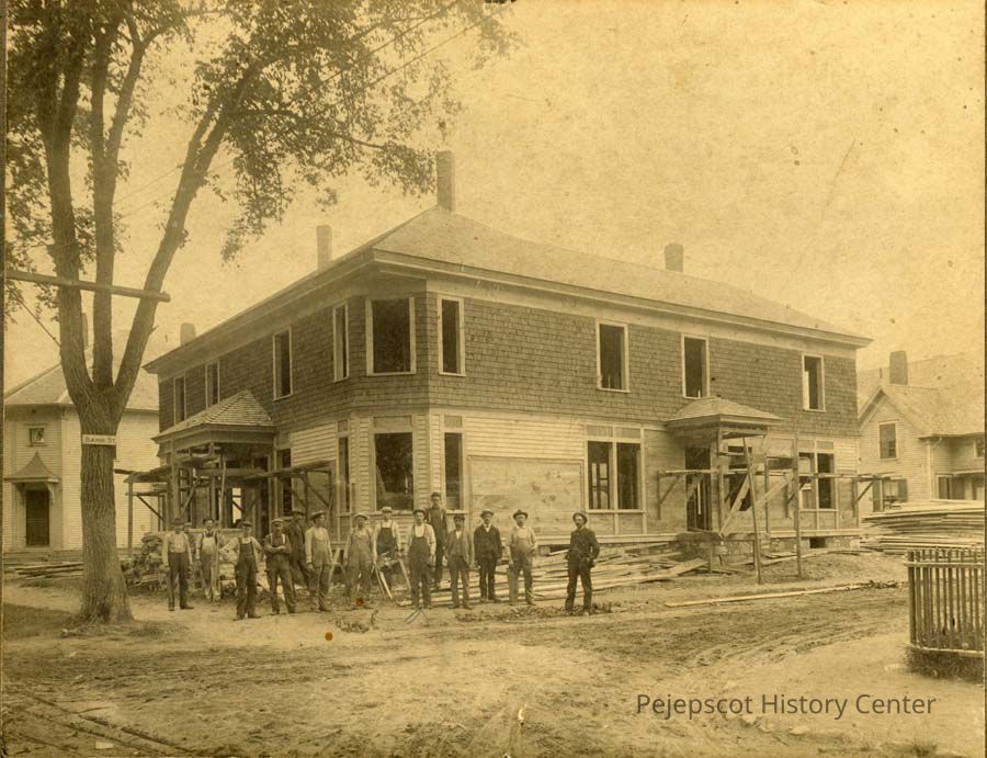 An undated B/W photo of workmen outside house being built at the corner of Bank and Federal Streets in Brunswick, Maine. "Clarence Elmer Kincaid, born Sept. 14, 1881" on the back.