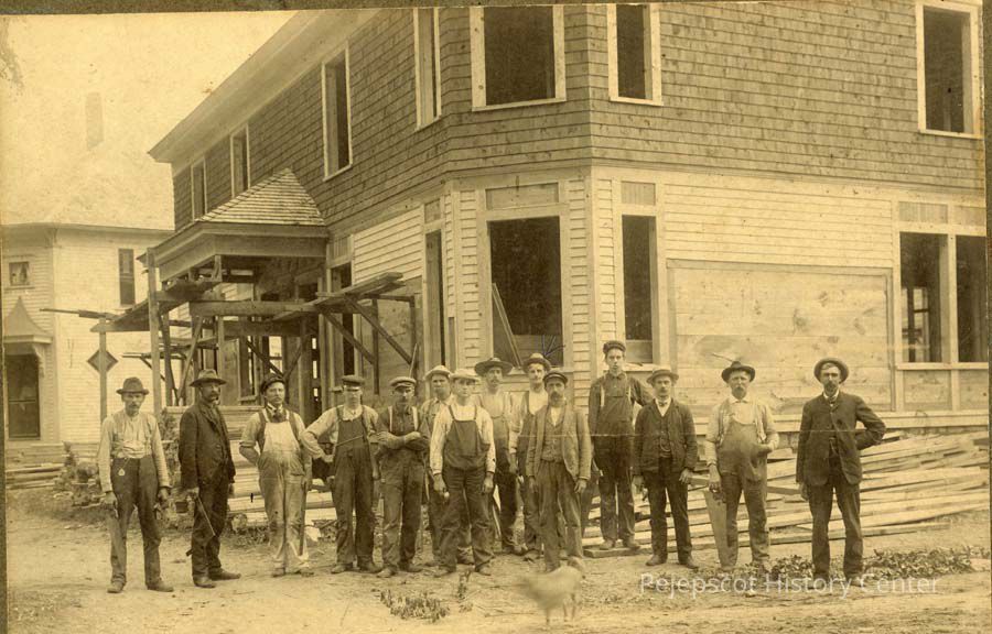 An undated B/W photo of workmen outside a house being built at the corner of Bank and Federal Streets in Brunswick, Maine. "Clarence Elmer Kincaid, born Sept. 14, 1881" on the back. Man second from right is Joseph Emery Noyes son of Zina and Catharine Noyes of Topsham.