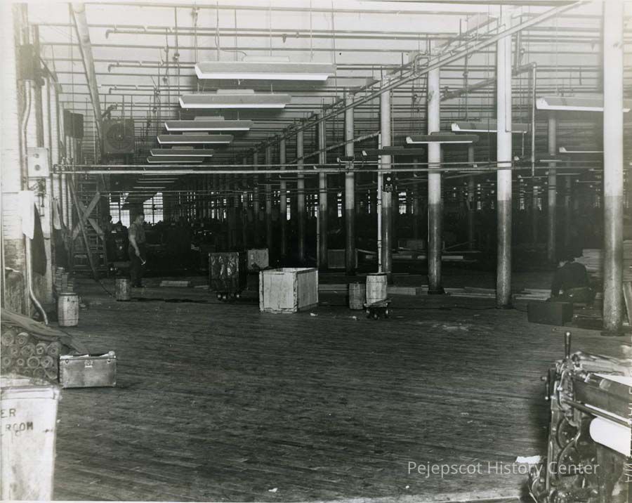 A B/W photograph of workmen putting down a new floor in the Weave Room of Cabot Mill(?). Undated