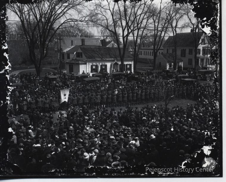 Large crowd welcomes home World War I servicemen Maine Street across from Town Hall, Brunswick, Maine.