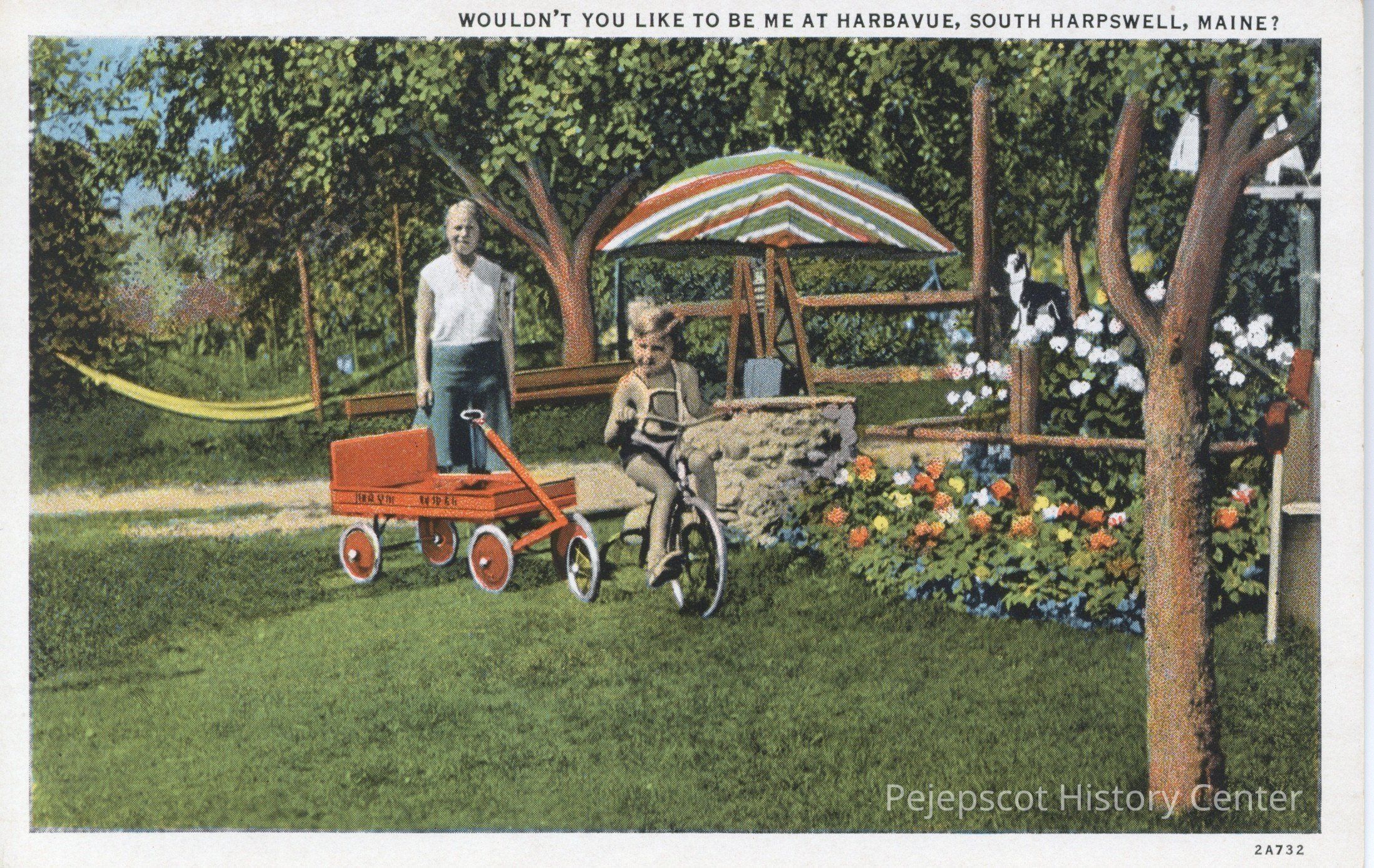 Color photo postcard of people on the Harbavue House lawn, South Harpswell, Maine.Collection