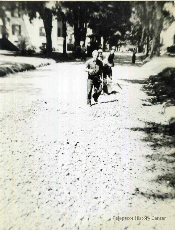 An undated black and white photograph of a WPA crew at work on a sidewalk project on Union Street, Brunswick.