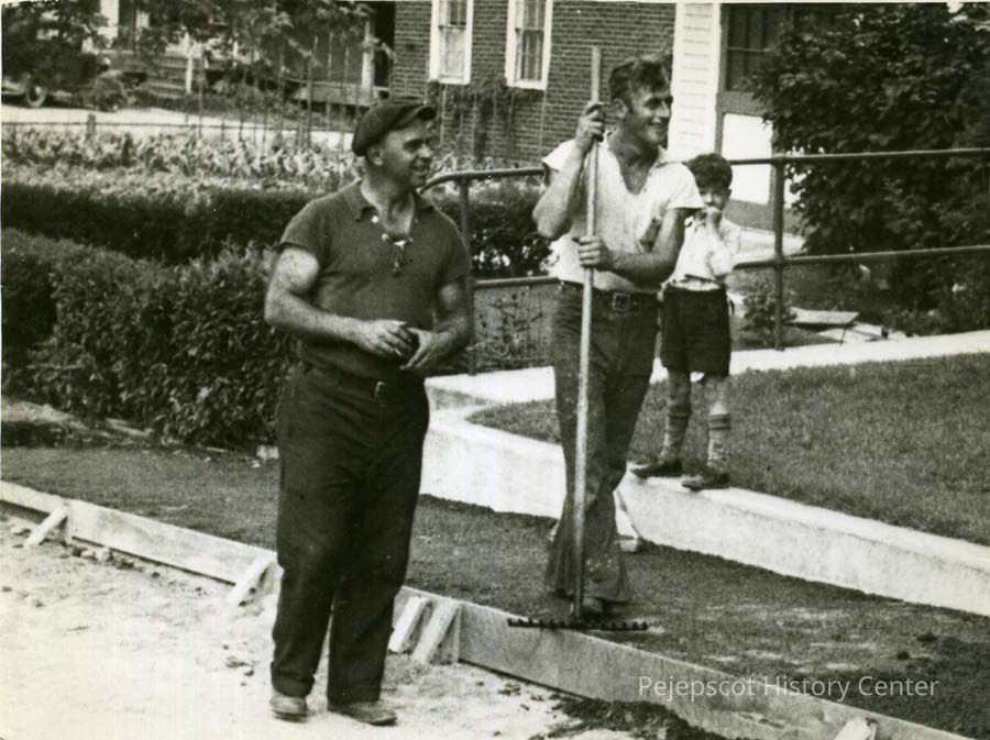 An undated black and white photograph of two workers on the WPA sidewalk project on Union Street, Brunswick. Nap Gagne is indicated as the boss. A young boy is in the background.