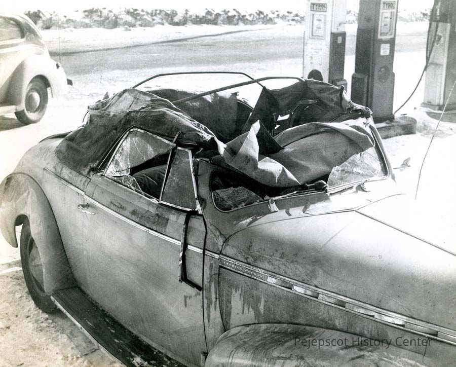 A B/W photograph of a wrecked car. This photo is not listed in the accession paper work. Undated