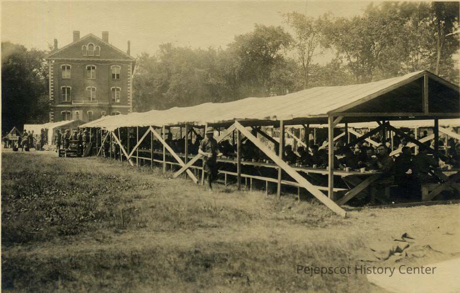 A B/W photograph of a WW I mess tent on Bowdoin College Campus.