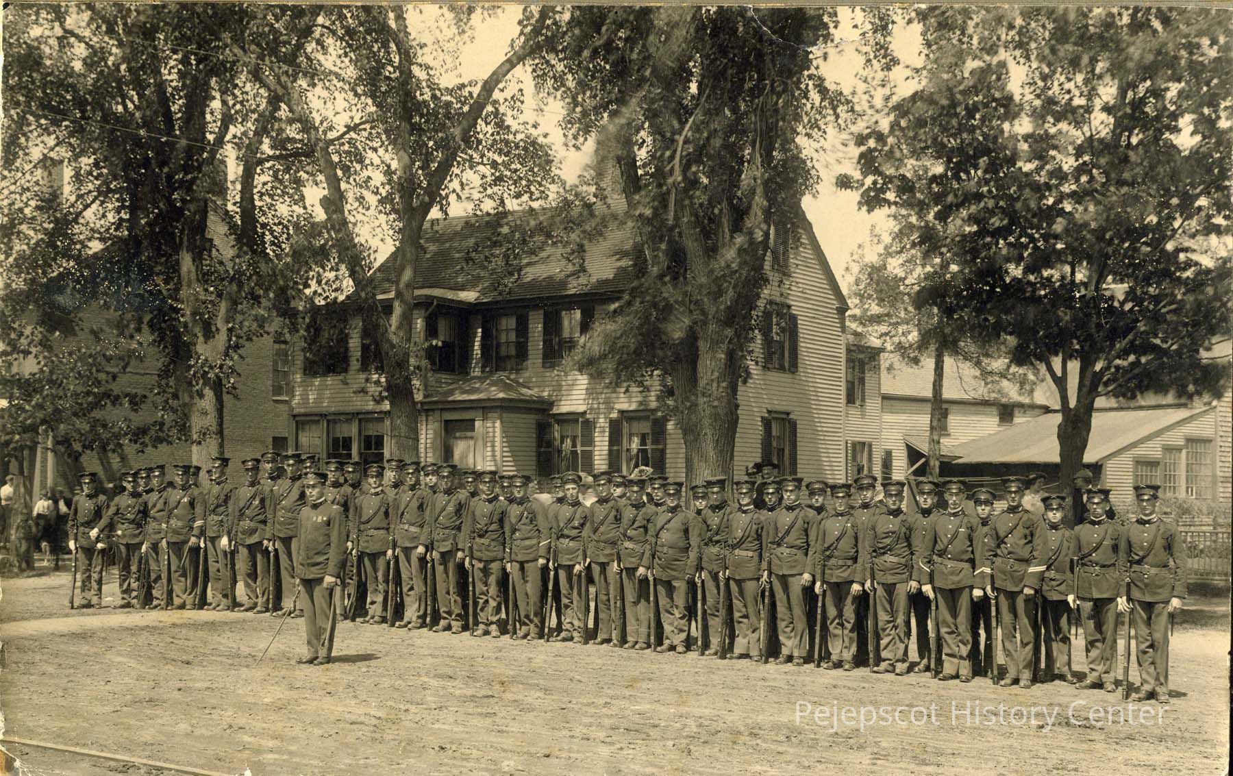 An undated B/W photo of WW I Brunswick National Guard Company "K". Harrison Hubbard is 2nd from right. Brunswick, Maine.