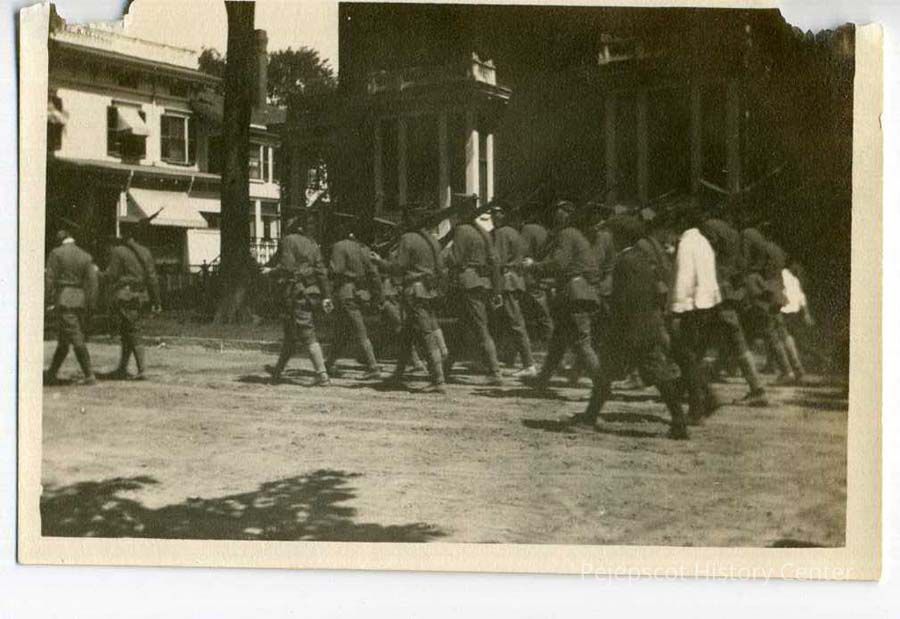 B/W photo of WW I soldiers marching. Some are in uniform, some in civilian clothing.