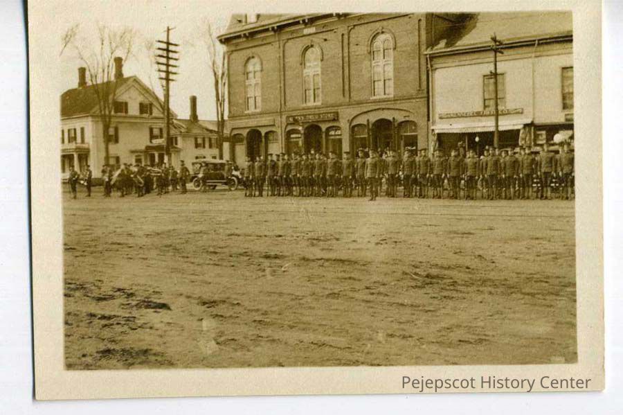 B/W photo of WW I soldiers on Maine Street with the Army Band.