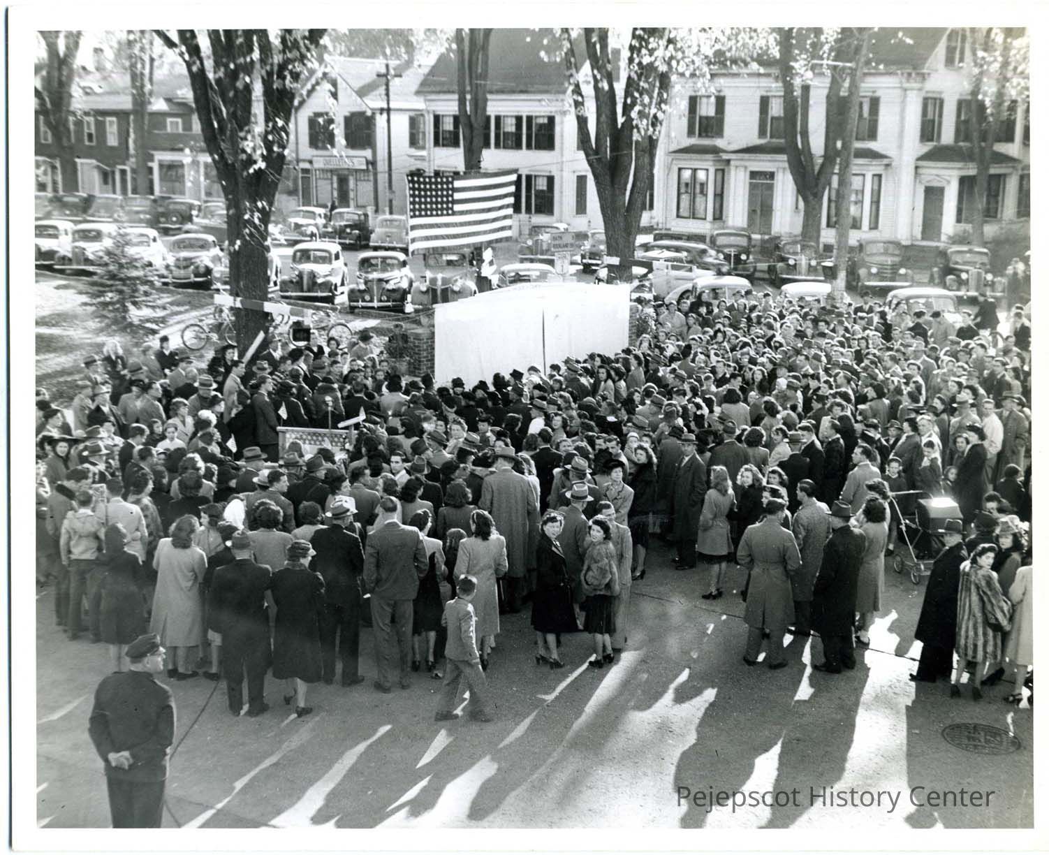 Black and white photo of a crowd gathered for the dedication of a memorial to WWII service men. Brunswick, Maine. The memorial was demolished in 1992. Undated.