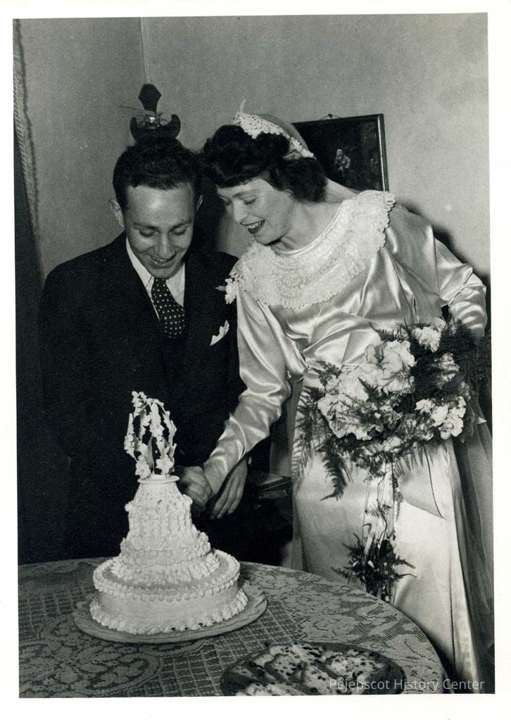 Betina and Vance Bourjailly cutting their wedding cake. December 26, 1947