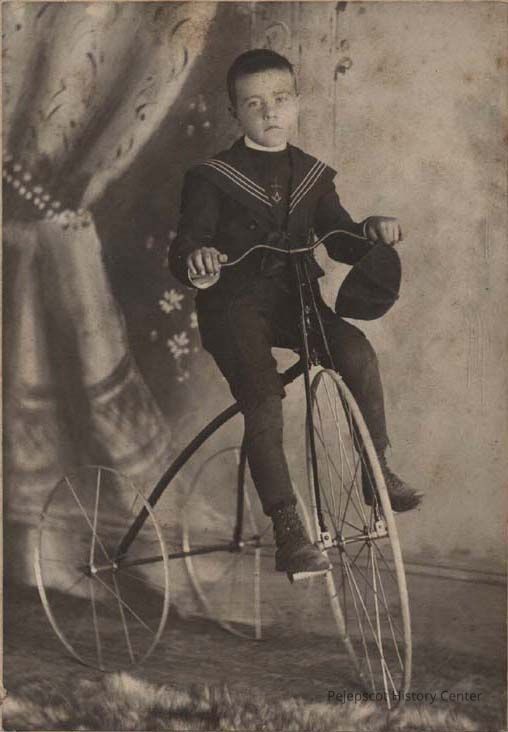 A B/W photograph of a young boy on an iron-wheeled tricycle. Undated