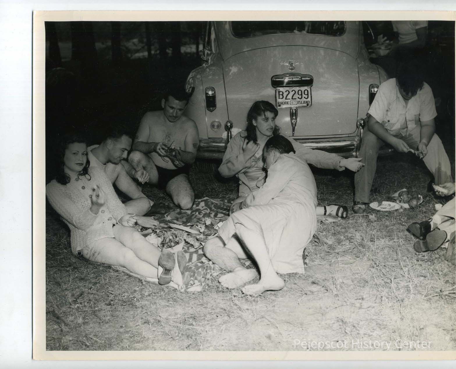 Six young people by a car at the Verney Mill picnic at Thomas Point Beach. Undated