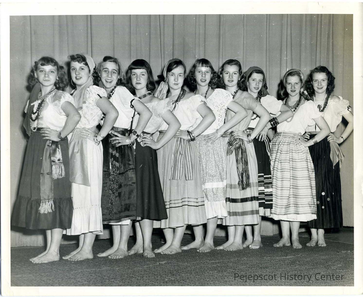 A picture of 10 Brunswick High School women in gypsy dress and lined up for the camera. From left to right they are; Vivian Michaud, Janice Hall, Gloria Menard, Mimi Leith, Mary Walker, Lois Pratt, Barbara Hall, Marilyn Brackett, Dorothy Coombs, and ? Barbara Skolfield. "copy neg" UndatedLexicon