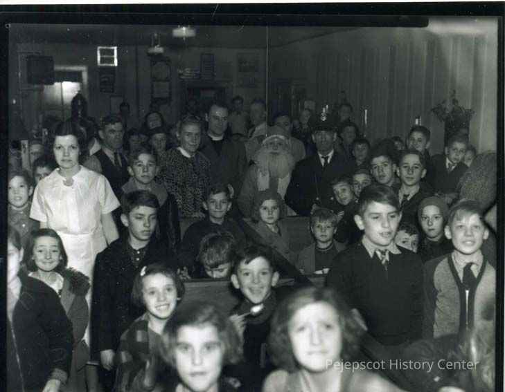 A crowd of people face the camera with children in the foreground and adults at the back. This is a photo of the Lewis Zaminis Christmas party of 1940 which was a yearly event.