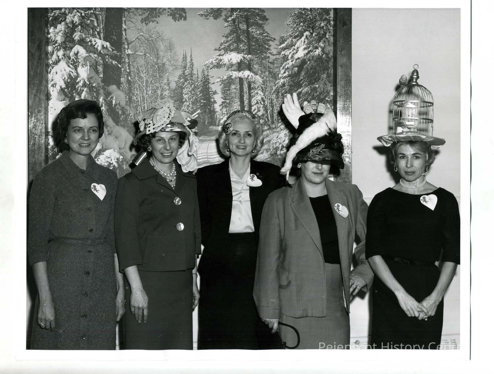 "The winners of the Zany Hat Contest held by the Officer's Wives Club at Topsham AFS on Tuesday Feb 13, are left to right; 1. Mrs WM Thomas 'Kraut Head'; 2. Mrs. William Shepherd 'May Day', the most original; 3. Mrs. David Babineau 'Grapefruit Twist', the prettiest; 4. Mrs. James Buckey 'Nightmare'; and 5. Mrs James Zweizig, 'Puddy Cat', the craziest." UndatedLexicon