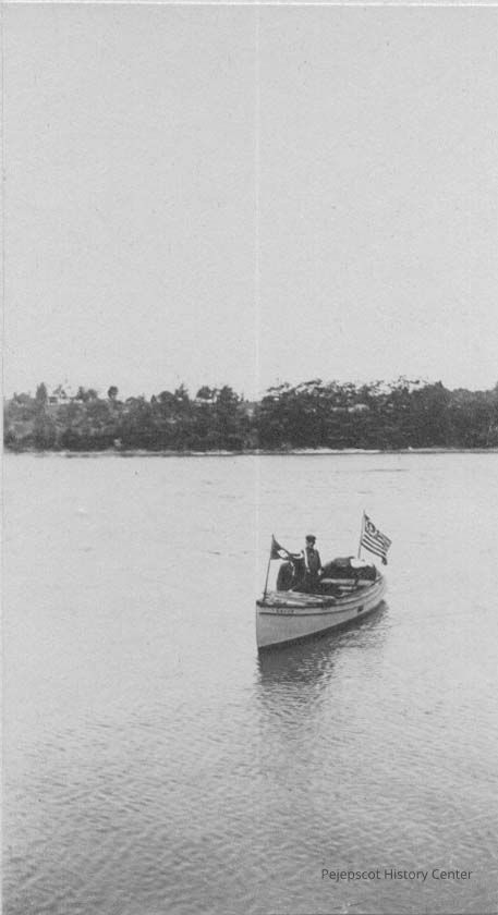 An undated black and white photo of B/W photograph of Zina Clifford and his boat on New Meadows River.
