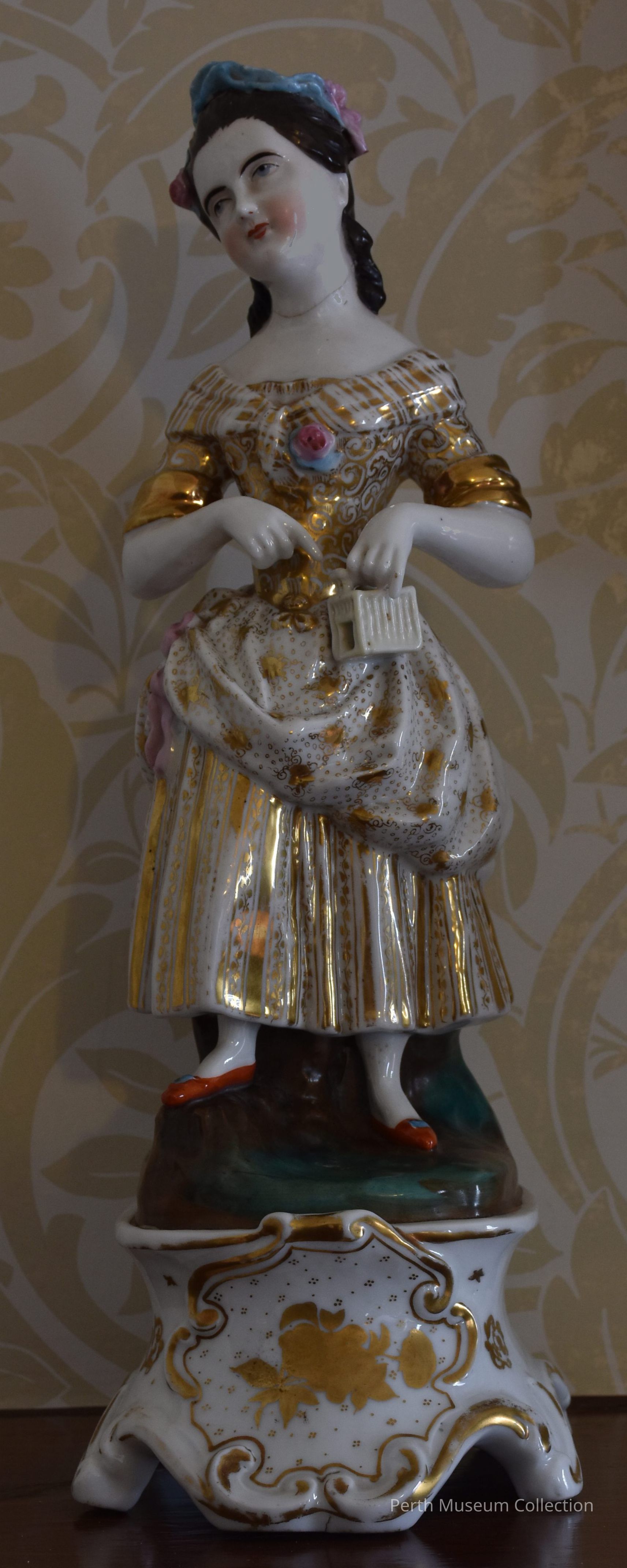 This is a large figurine of a girl in an 18th Century Italian peasant costume. She is carrying a cricket cage in her left hand and is pointing to it with her right. There is a lot of gilt work on her costume. This gilt work consists of the stripes on her neckerchief, the scrollwork on the pointed bodice, the gold flowers on the looped up overskirt and the stipes on her ankle length underskirt. She has a pink rose at the bodice and pink ribbons on one of her hips. She is wearing rust coloured shoes with blue buckles. Her hat is a blue pancake-shaped cap that is decorated with pink ribbons. She has a pink rose in her hair. The cap looks like the sort of cap seen in illustrations of 18th century Italian peasant girls. She has black hair and blue eyes, with ringlets hanging down to her shoulders. She is standing on an elaborate gold and white scrolled base, that has five scrolled feet. This figure greatly resembles the porcelain dolls of the mid 19th century. The head has been broken off at one time and been re-glued. It is the companion piece to 967.6. there are no identifying marks