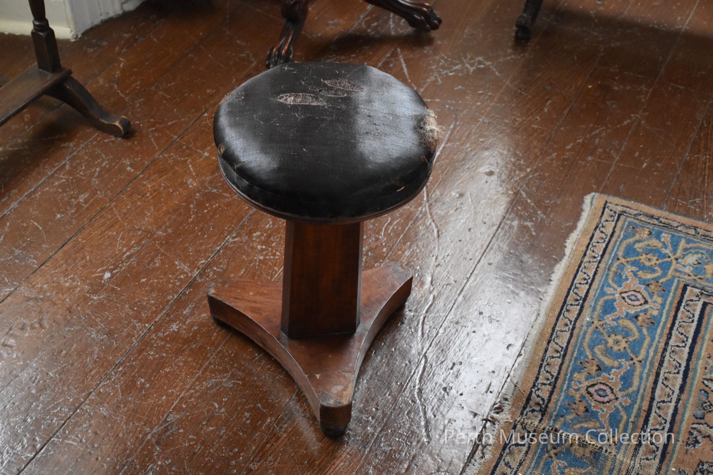 This mahogany stool belongs to the pianoforte (obj. 967.25). It is made in the North American version of the French Empire or Classical Style. It consists of a revolving round top supported by a triangular base with three black bun-shpaed feet. The top is covered in the original horsehair and it is worn in spots. The gimping has decomposed. Circa 1840Dimensions